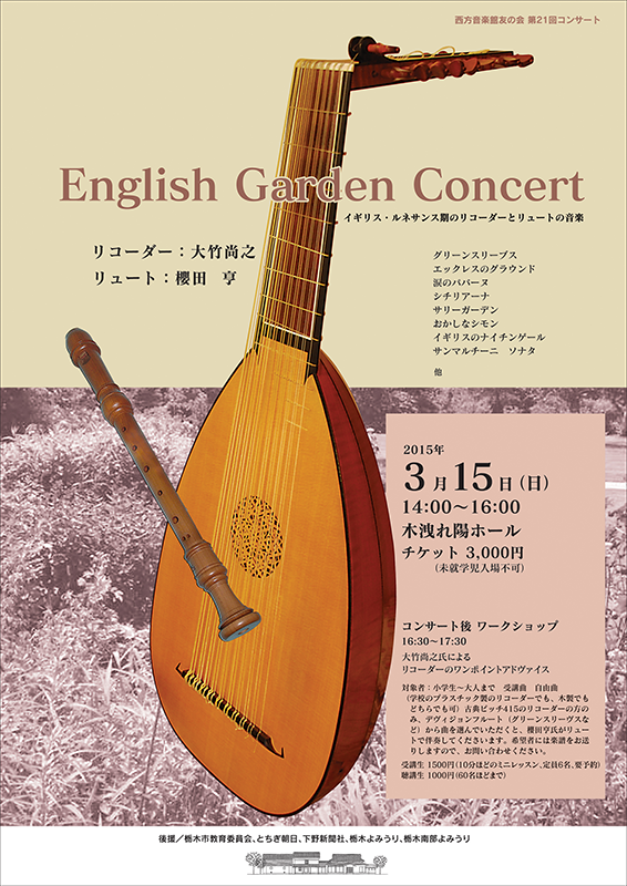 | 内容 | 受講曲、自由曲 学校のプラスチック製のリコーダーでも、木製でもどちらでも可。 古典ピッチ415のリコーダーの方のみ、デヴィジョンフルート(グリーンスリーヴスなど)ららの曲を選んでいただくと、櫻田亨氏がリュートで伴奏をしてくださいます。 希望者には楽譜をお送りしますので、お問い合わせ下さい。 |