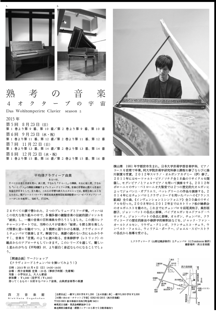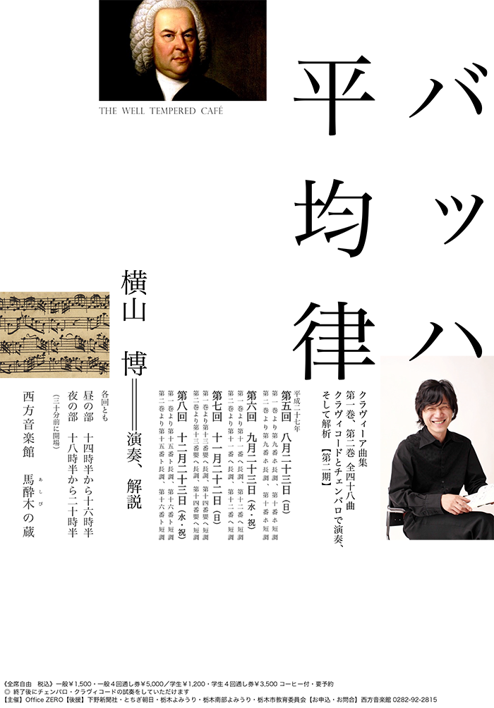 | 内容 | J.S .バッハ|平均律クラヴィーア曲集 ■第5回 第1巻より第9番ホ長調、第10番ホ短調/第2巻より第9番ホ長調、第10番ホ短調 ■第6回 第1巻より第11番へ長調、第12番へ短調/第2巻より第11番へ長調、第12番へ短調 ■第7回 第1巻より第13番へ長調、第14番へ短調/第2巻より第13番へ長調、第14番へ短調 ■第8回 第1巻より第15番ト長調、第16番ト短調/第2巻より第15番ト長調、第16番ト短調 |