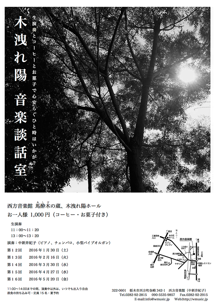 | 場所 | 西方音楽館 馬酔木の蔵、木洩れ陽ホール |