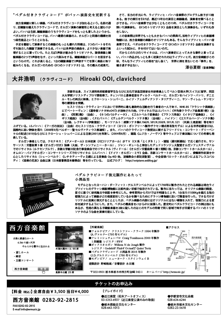 | お申込 | ■西方音楽館 ※会員の方はこちらまで TEL:0282-92-2815 ■近江楽堂(松木アートオフィス) 03-5353-6937(近江楽堂公演のみの取扱) ■栃木県総合文化センター TEL:028-643-1013 ■宇都宮市文化会館 TEL:028-634-6244 ■栃木市栃木文化センター TEL:0282-23-5678 |