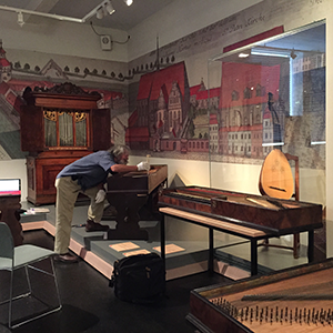 この楽器に関しては近年ヨーロッパを中心に数台の復元楽器が製作されている。ヨーテボリのオルガン研究所のJoel Speerstraの描いた図面には有用な情報が多く含まれており、製作に当たっては大いに参考にさせていただいた。しかしながら、図面に表し切れていないか、あるいは理解しきれない箇所があり、どうしてもオリジナルを見ないと正確な復元は難しいと判断し、以前にサルテリオの採寸などで便宜を図っていただいた、ライプツィッヒのGRASSI博物館のMarkus Brosig氏に再び調査依頼をしたところ、そういう仕事なら、誰にも邪魔されない休館日の月曜日に来ると良いといって休みの日にわざわざ開けていただいた。そればかりでなく、Speerstraが同楽器の調査をしたときの指導教官であるエディンバラ大学のJohn Barnesが独自に書いたこの楽器に関する研究論文とその時に撮影した大量の写真のコピーを取らせていただいた。