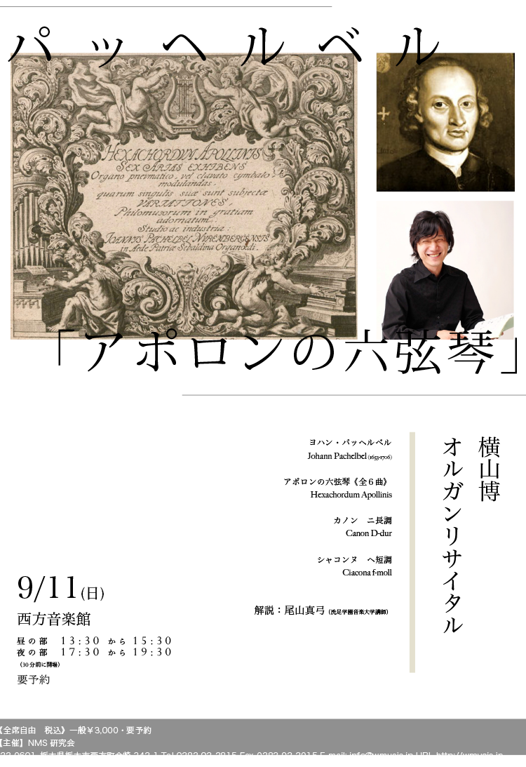 | 内容 | ヨハン・パッヘルベル Johann Pachelbel (1653-1706) アポロンの六弦琴《全6曲》 Hexachordum Apollinis カノン ニ長調 Canon D-dur シャコンヌ ヘ短調 Ciacona f-moll |