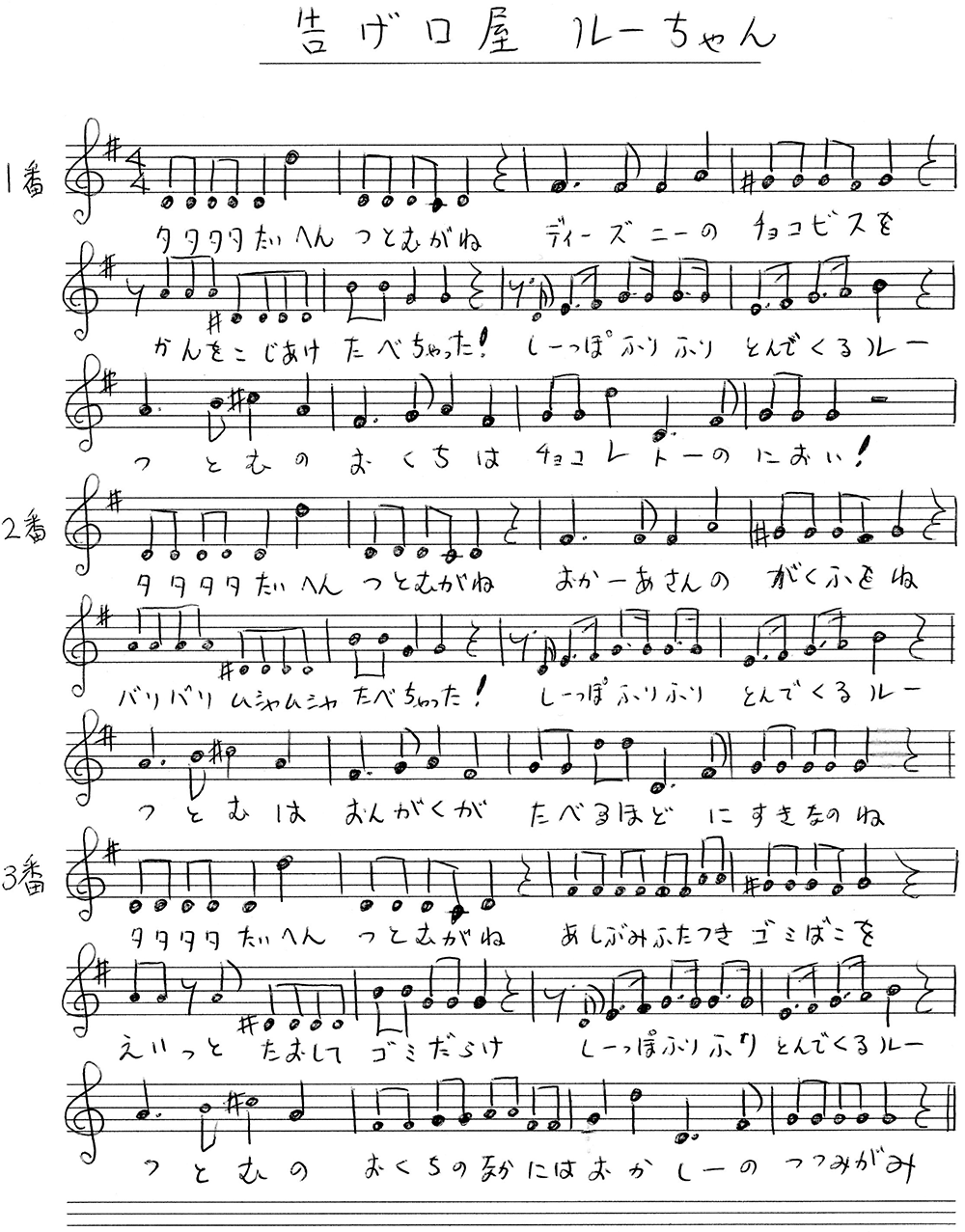 「告げ口屋ルーちゃん」の歌 「タタタタ大変、つとむがね、ディズニーのチョコビスを、 缶をこじ開け食べちゃった!」 しっぽふりふり飛んでくるルー。 つとむのお口はチョコレートの匂い! 「タタタタ大変、つとむがね、お母さんの楽譜をね、 バリバリムシャムシャ食べちゃった!」 しっぽふりふり飛んでくるルー。 つとむは音楽が食べるほどに好きなのね! 「タタタタ大変、つとむがね、足踏み蓋つきゴミばこを、 えいっと倒してゴミだらけ。」 しっぽふりふり飛んでくるルー。 つとむのお口の中には、お菓子の包み紙。 <<前へ 目次へ 次へ>> 篤志の方々のご寄付により、フォルテ・ピアノが、西方音楽館 木洩れ陽ホールに設置されました。 クリストファー・クラーク1994年製 (A.ヴァルター1795年モデル) 故小島芳子愛用の名器 まず、西方音楽館 木洩れ陽アップルパイ を販売します。 「3本足のルー」が完成しました。ルーが教えてくれたことは、「子供が育つ」ということ、さらに「人間が育つ」ということへの、励ましとヒントになりました。 日本モーツァルト愛好会のホームページ