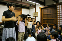 いつも自宅敷地内の小さな蔵で少人数の子供を相手に「わらべうた」をやっています。こんな広い空間(30畳)でこんなにたくさんの子供(22人)を相手にしたのは初めてでした。「わらべうた」はやはり子供たちのものであること、子供たちが体と心を使って活き活きと楽しく遊べるものであることを、確認することができた貴重な時間でした。