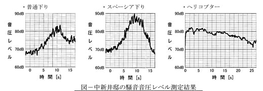 騒音の程度は現在分析中とのこと。その詳細は近々永田さんから報告があるはずですが、ここでは、東武電車の走行音とヘリコプター騒音の、音圧レベルの時間経過の状況を、お借りした図で示します。縦軸が音圧レベル(dB)、横軸は時間(秒)です。電車とヘリコプターでは音色も違いますが、スペーシアの通過音は音圧レベルのピークで90dBになります。このような音源の遮音は普通の木造では困難で、コンクリート造が必要になるという話でした。