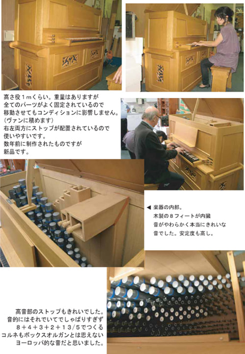 このボックスオルガン、機能も用途も、ポジティフ・オルガンと同じです。しかし、もう少し背が高く、アップライトピアノのような形をしていて、さらに取っ手が付いているので移動しやすいのです。造りもしっかりしていてヴァンに積めるそうです。