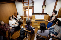 10月14日、いよいよオルガン試聴会。現在の蔵でのオルガンの響きを、建築家の野崎さんと音響設計の永田穂さんに聴いて頂くことが元々の目的でした。が、一時帰国している塚谷水無子さんが演奏を買って出て下さいましたので、折角の機会、ぜひ他の方々にも聴いて頂こうと思い、昼間お時間のありそうな近しい方々十数人にお声をかけ、一緒に聴いて頂きました。