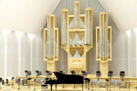 中の形状は、旧石橋メモリアルホールに則り天井が船底型、ステージ正面には新ホール完成を待って解体保存されていた旧ホールのパイプオルガンが、その確固たる存在を示していた。